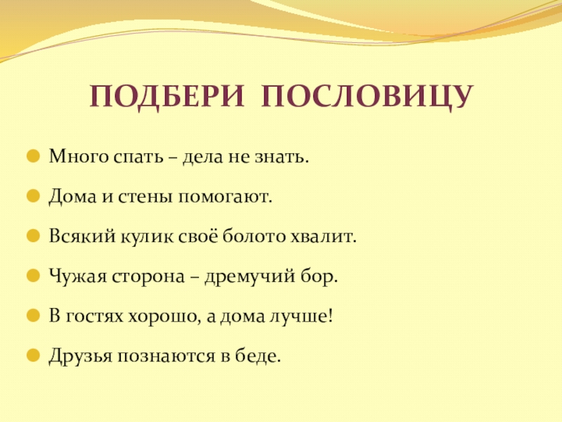 Слайд 24Подбери пословицу