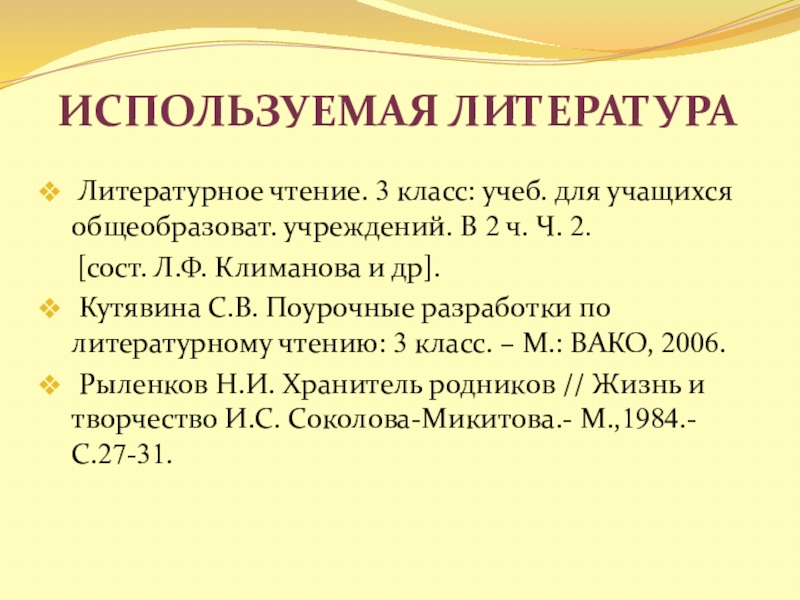 Кутявина С.В. Поурочные разработки по литературному чтению: 3 класс. – М.: BАКО, 2006.