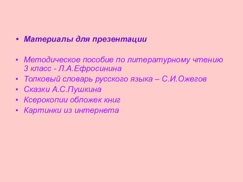 Материалы для презентации Методическое пособие по литературному чтению 3 класс - Л.А.ЕфросининаТолковый словарь русского языка – С.И.ОжеговСказки