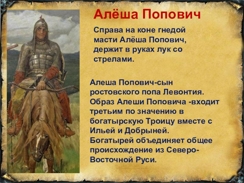 Справа на коне гнедой масти Алёша Попович, держит в руках лук со стрелами.