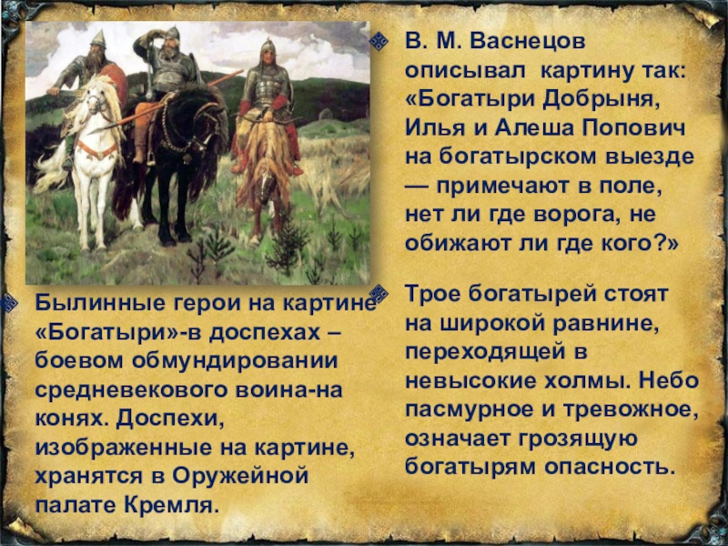 В. М. Васнецов описывал картину так: «Богатыри Добрыня, Илья и Алеша Попович на богатырском выезде — примечают в поле, нет ли где ворога, не обижают ли где кого?»