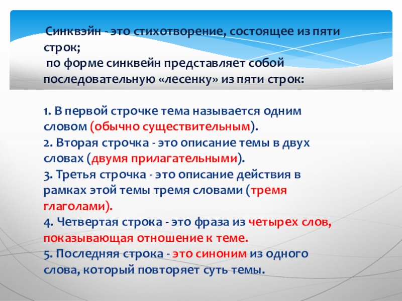 Слайд 14 Синквэйн - это стихотворение, состоящее из пяти строк;