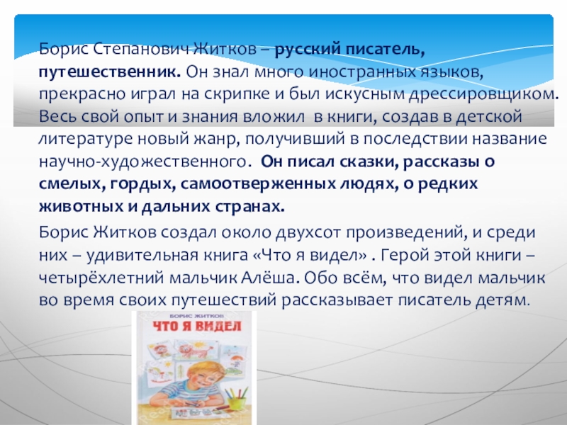 Борис Житков создал около двухсот произведений, и среди них – удивительная книга «Что я видел» . Герой этой книги – четырёхлетний мальчик Алёша. Обо всём, что видел мальчик во время своих путешествий рассказывает писатель детям.