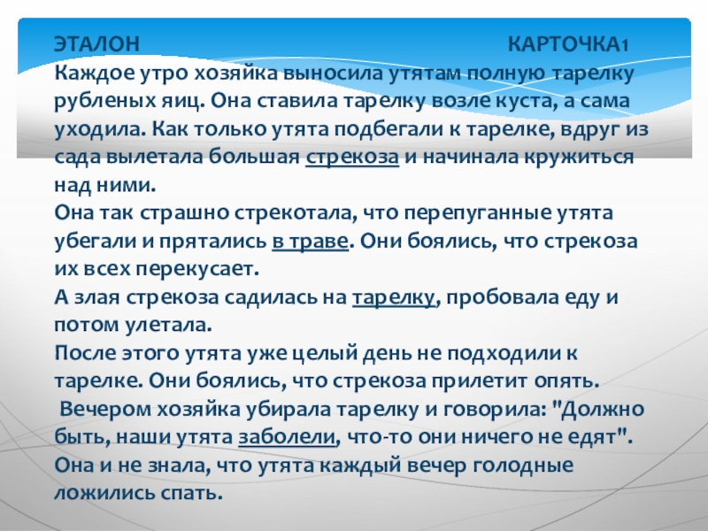 Каждое утро хозяйка выносила утятам полную тарелку рубленых яиц. Она ставила тарелку возле куста, а сама уходила. Как только утята подбегали к тарелке, вдруг из сада вылетала большая стрекоза и начинала кружиться над ними.
