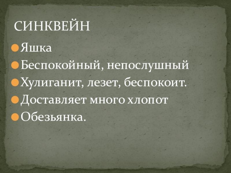 СИНКВЕЙНЯшкаБеспокойный, непослушныйХулиганит, лезет, беспокоит.Доставляет много хлопотОбезьянка.