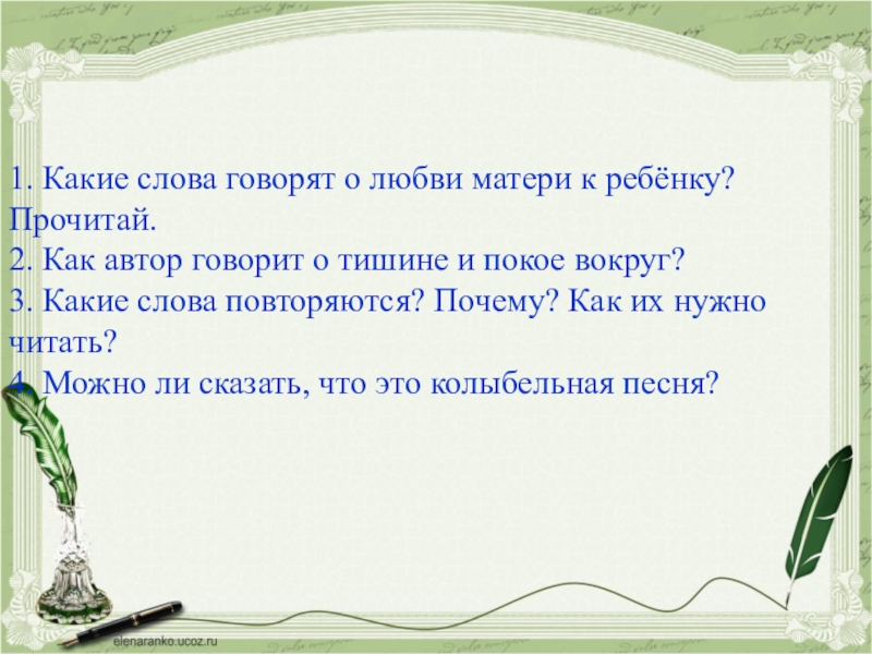 автор говорит о тишине и покое вокруг?  3. Какие слова повторяются? Почему? Как их нужно читать?  4. Можно ли сказать, что это колыбельная песня?