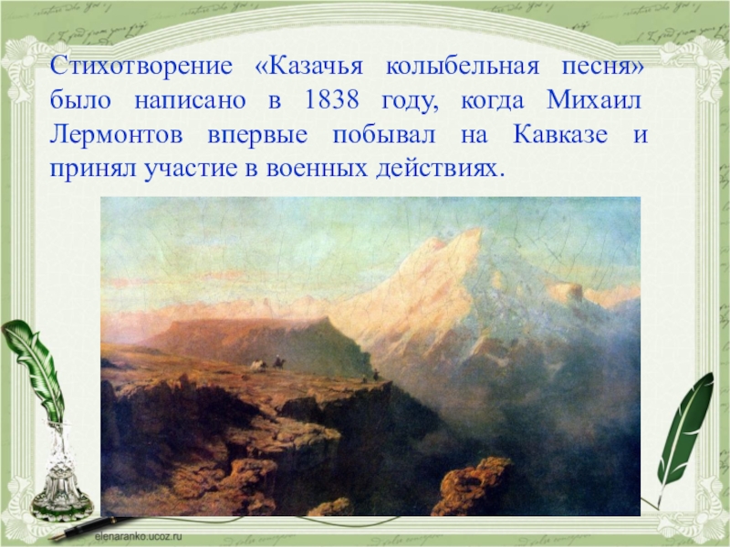 Стихотворение «Казачья колыбельная песня» было написано в 1838 году, когда Михаил Лермонтов впервые побывал на Кавказе и