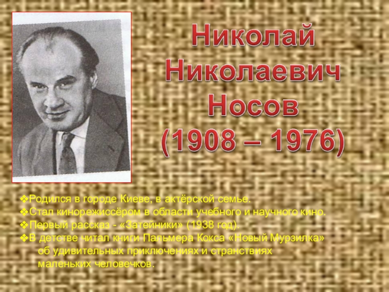 Родился в городе Киеве, в актёрской семье.Стал кинорежиссёром в области учебного и научного кино.Первый рассказ - «Затейники» (1938 год).В детстве читал книги Пальмера Кокса «Новый Мурзилка» об удивительных приключениях и странствиях маленьких человечков.
