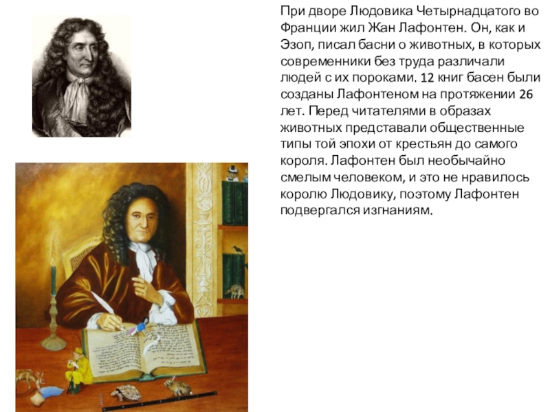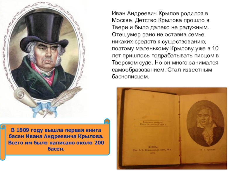 Иван Андреевич Крылов родился в Москве. Детство Крылова прошло в Твери и было далеко не радужным. Отец умер рано не оставив семье никаких средств к существованию, поэтому маленькому Крылову уже в 10 лет пришлось подрабатывать писцом в Тверском суде. Но он много занимался самообразованием. Стал известным баснописцем.