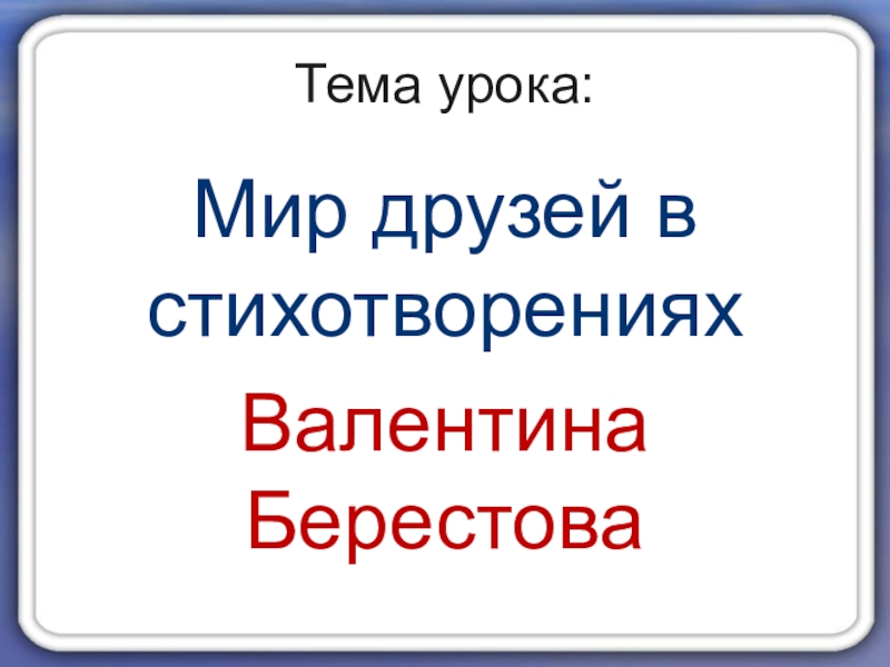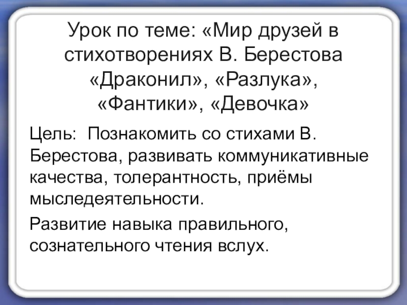 Цель: Познакомить со стихами В. Берестова, развивать коммуникативные качества, толерантность, приёмы мыследеятельности.