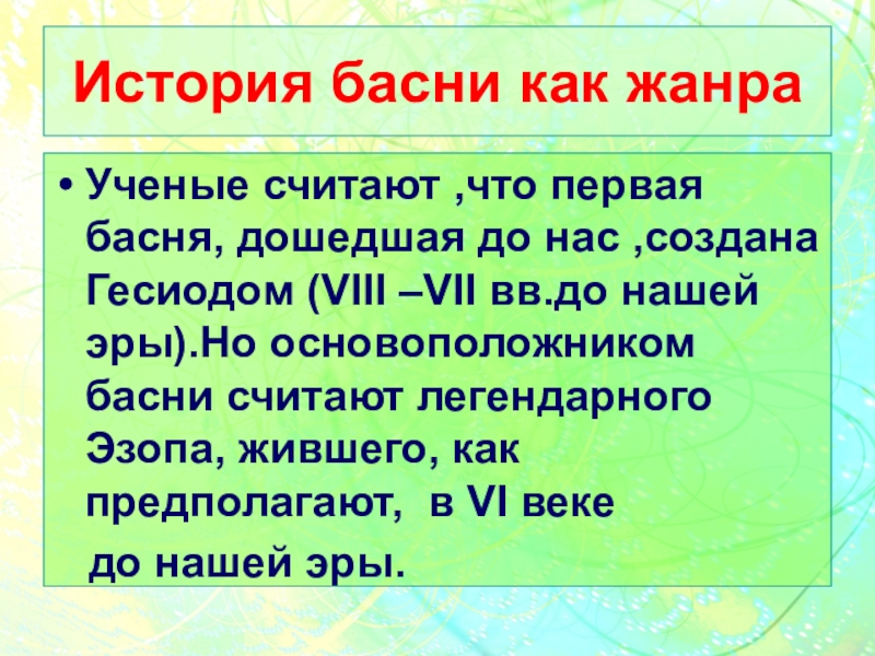 История басни как жанраУченые считают ,что первая басня, дошедшая до нас ,создана Гесиодом (VIII –VII вв.до нашей