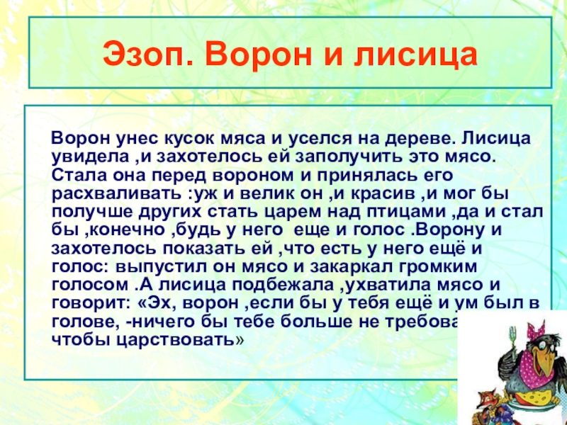 Слайд 6Эзоп. Ворон и лисица