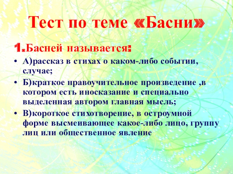 Слайд 24Тест по теме «Басни»