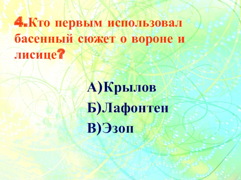 4.Кто первым использовал басенный сюжет о вороне и лисице?А)КрыловБ)ЛафонтенВ)Эзоп