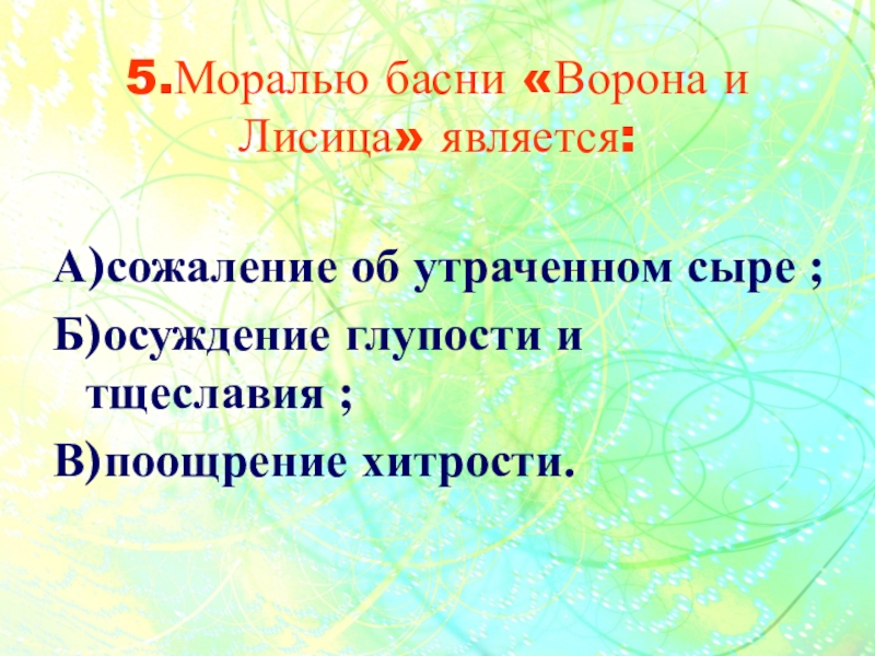 5.Моралью басни «Ворона и Лисица» является:А)сожаление об утраченном сыре ;Б)осуждение глупости и  тщеславия ;В)поощрение хитрости.