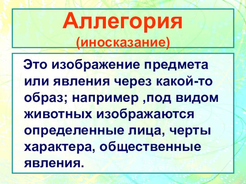 Аллегория    (иносказание) Это изображение предмета или явления через какой-то образ; например ,под видом животных