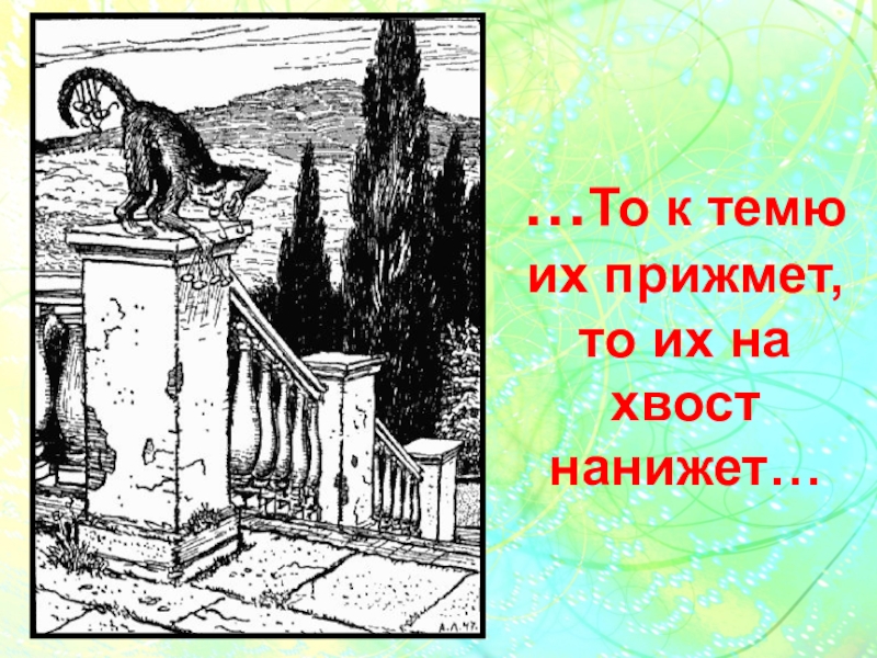 Слайд 13…То к темю их прижмет, то их на хвост нанижет…