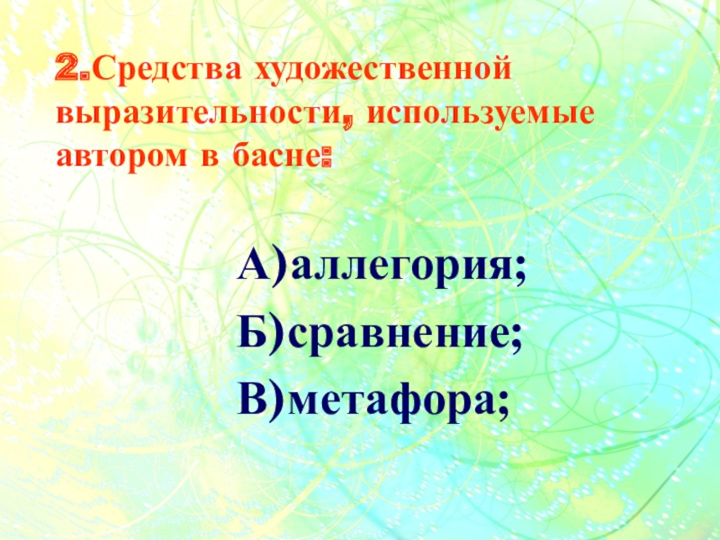 2.Средства художественной выразительности, используемые автором в басне:А)аллегория; Б)сравнение;В)метафора;