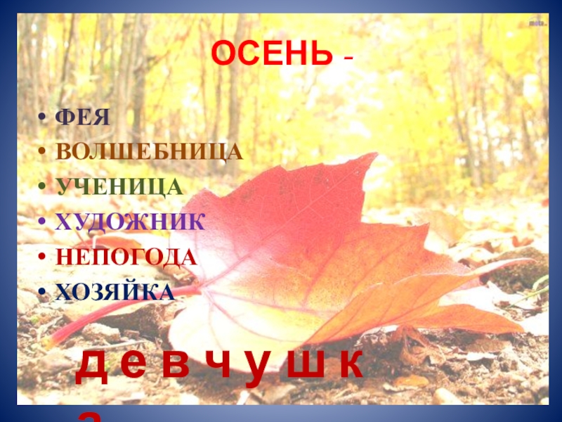 ОСЕНЬ -ФЕЯВОЛШЕБНИЦАУЧЕНИЦАХУДОЖНИКНЕПОГОДАХОЗЯЙКА д е в ч у ш к а