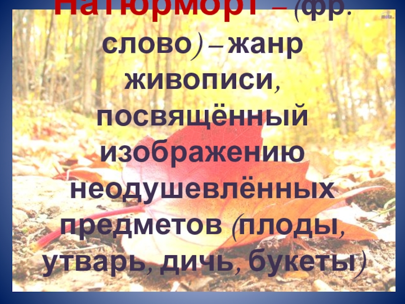 Слайд 9Натюрморт – (фр. слово) – жанр живописи, посвящённый изображению неодушевлённых предметов