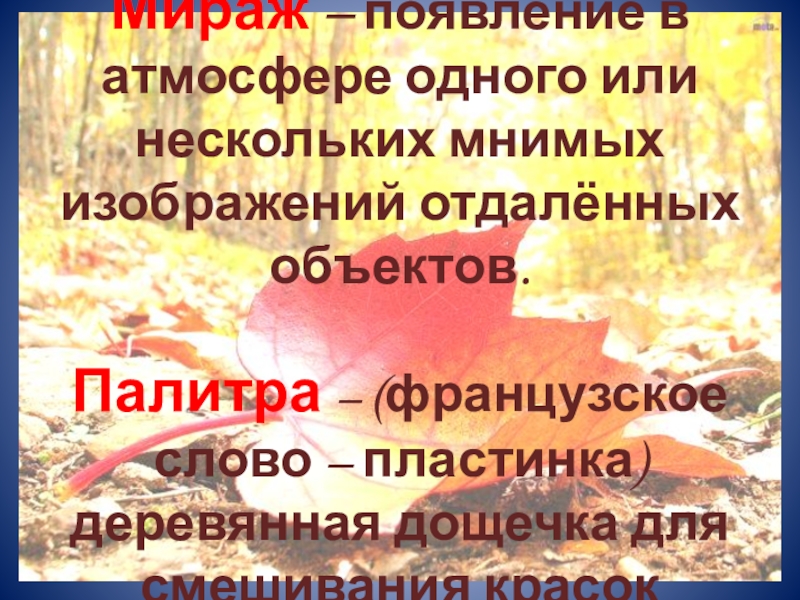 Мираж – появление в атмосфере одного или нескольких мнимых изображений отдалённых объектов. Палитра – (французское слово – пластинка) деревянная дощечка для смешивания красок