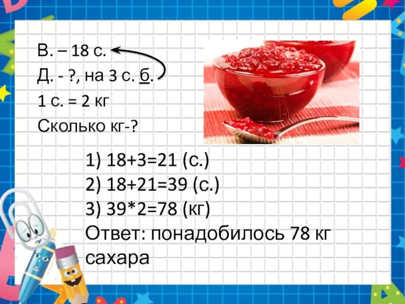 1) 18+3=21 (с.) 2) 18+21=39 (с.) 3) 39*2=78 (кг) Ответ: понадобилось 78 кг сахараВ. – 18 с.Д.