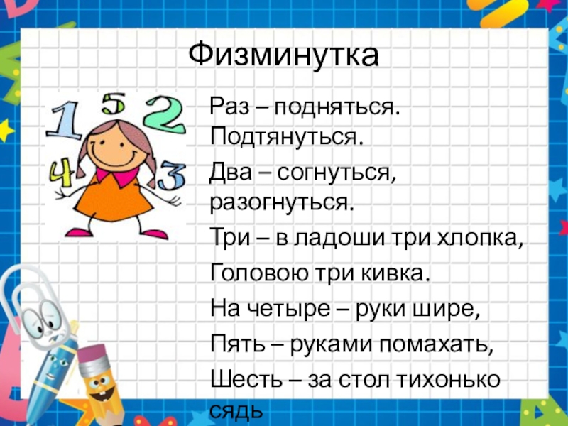 Физминутка Раз – подняться. Подтянуться.Два – согнуться, разогнуться.Три – в ладоши три хлопка,Головою три кивка.На четыре –