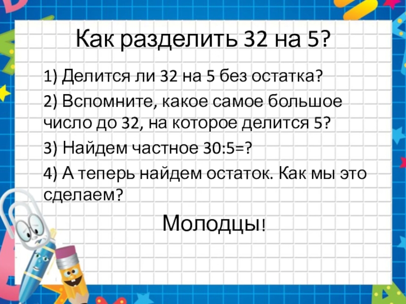Как разделить 32 на 5?1) Делится ли 32 на 5 без остатка?2) Вспомните, какое самое большое число