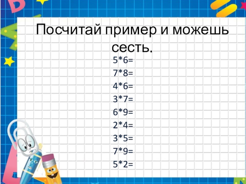 Посчитай пример и можешь сесть.5*6=7*8=4*6=3*7=6*9=2*4=3*5=7*9=5*2=