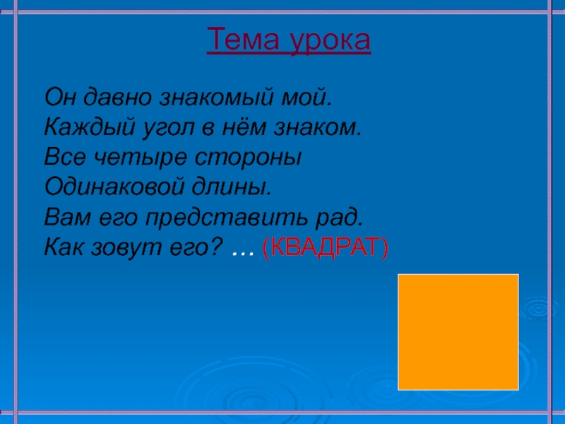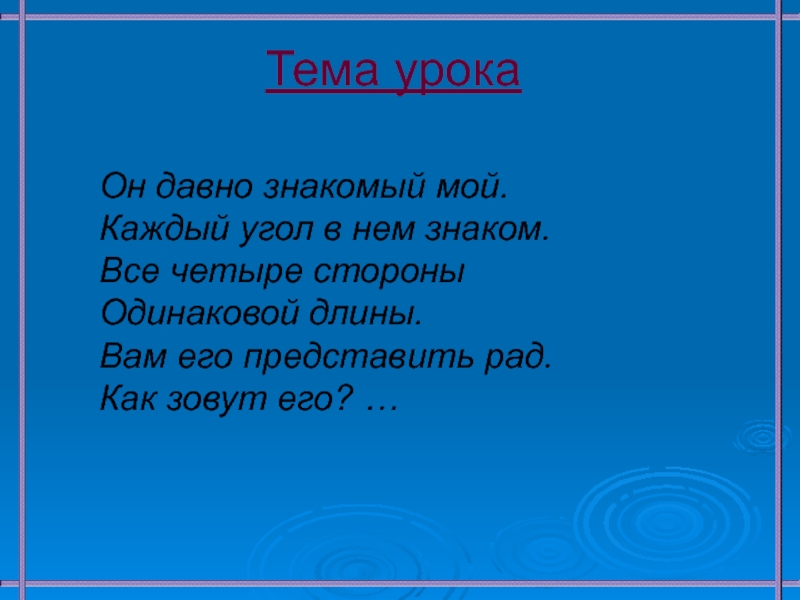 Тема урокаОн давно знакомый мой.Каждый угол в нем знаком.Все четыре стороны Одинаковой длины.Вам его представить рад.Как зовут