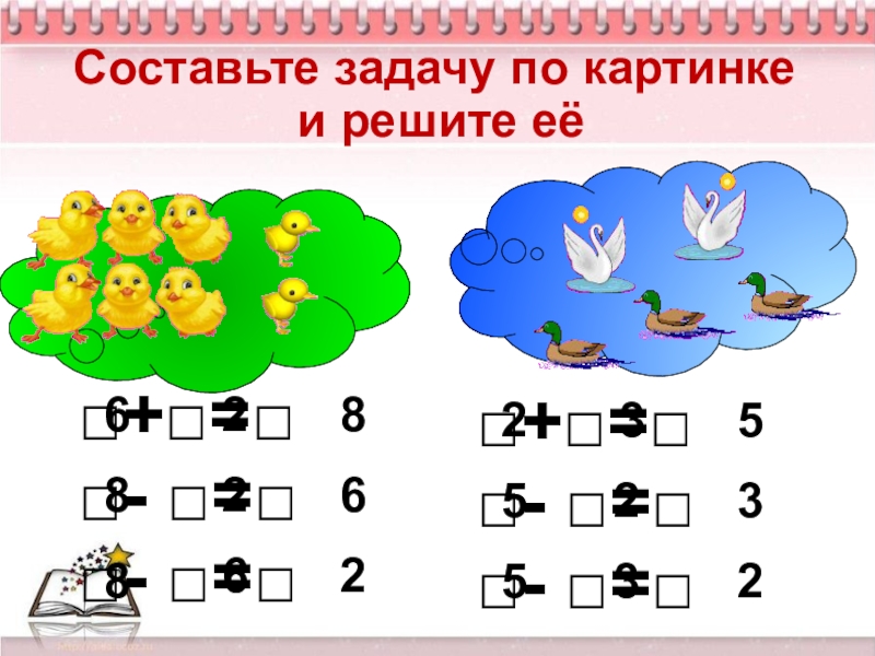 Составьте задачу по картинке и решите её□+□=□□- □=□□- □=□□+□=□□- □=□□- □=□628882266222333555
