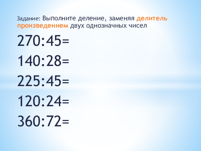 Задание: Выполните деление, заменяя делитель произведением двух однозначных чисел270:45=140:28=225:45=120:24=360:72=