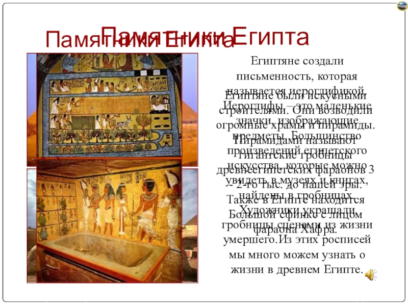Египтяне создали письменность, которая называется иероглификой. Иероглифы – это маленькие значки, изображающие предметы. Большинство произведений египетского искусства, которые можно увидеть в музеях и книгах, найдены в гробницах. Художники украшали гробницы сценами из жизни умершего.Из этих росписей мы много можем узнать о жизни в древнем Египте.