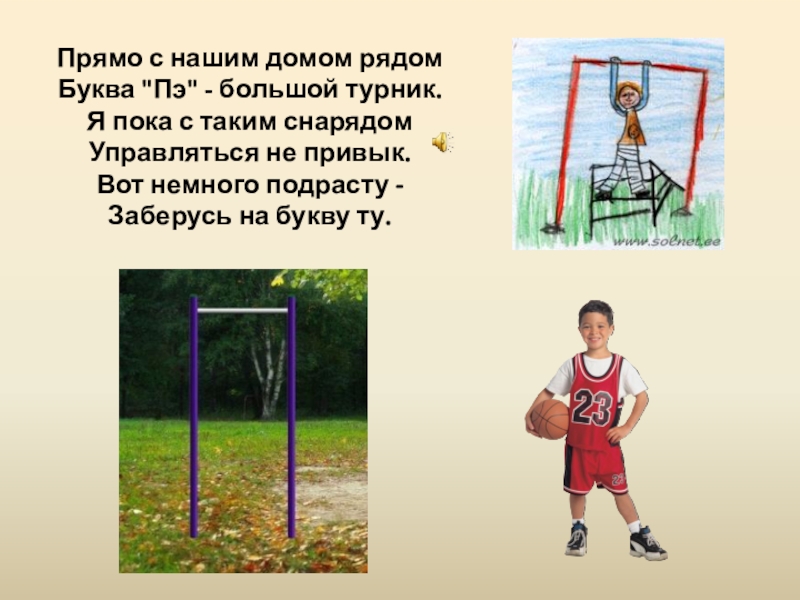 Слайд 7Прямо с нашим домом рядом Буква "Пэ" - большой турник. Я пока с