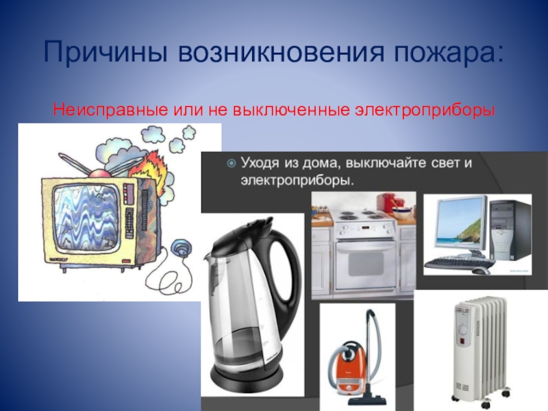 Причины возникновения пожара: Неисправные или не выключенные электроприборы