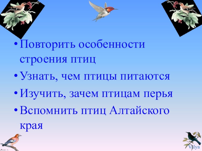 Повторить особенности строения птицУзнать, чем птицы питаютсяИзучить, зачем птицам перьяВспомнить птиц Алтайского края