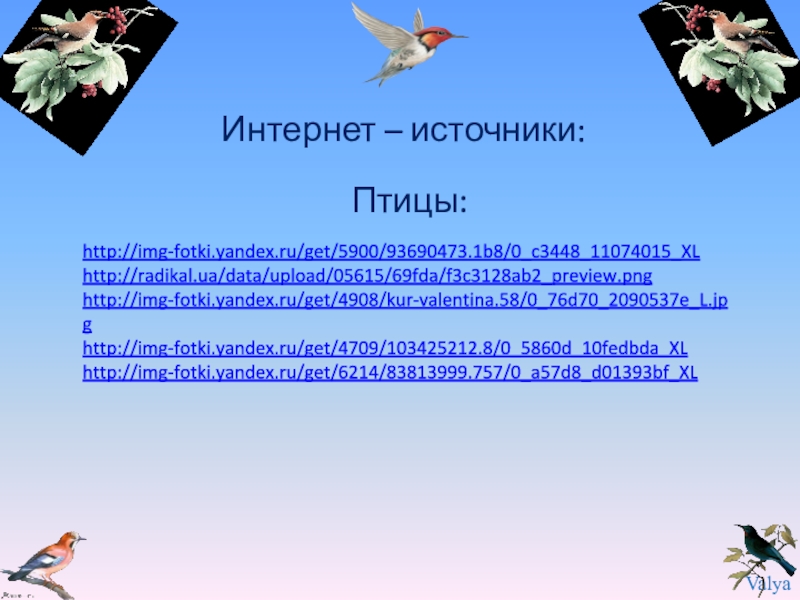 Интернет – источники: Птицы:http://img-fotki.yandex.ru/get/5900/93690473.1b8/0_c3448_11074015_XL http://radikal.ua/data/upload/05615/69fda/f3c3128ab2_preview.png http://img-fotki.yandex.ru/get/4908/kur-valentina.58/0_76d70_2090537e_L.jpg  http://img-fotki.yandex.ru/get/4709/103425212.8/0_5860d_10fedbda_XLhttp://img-fotki.yandex.ru/get/6214/83813999.757/0_a57d8_d01393bf_XL