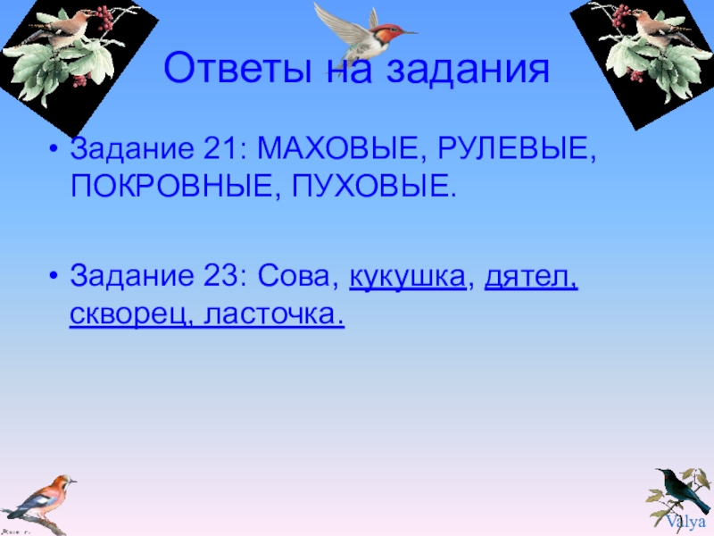 Ответы на задания Задание 21: МАХОВЫЕ, РУЛЕВЫЕ, ПОКРОВНЫЕ, ПУХОВЫЕ.Задание 23: Сова, кукушка, дятел, скворец, ласточка.