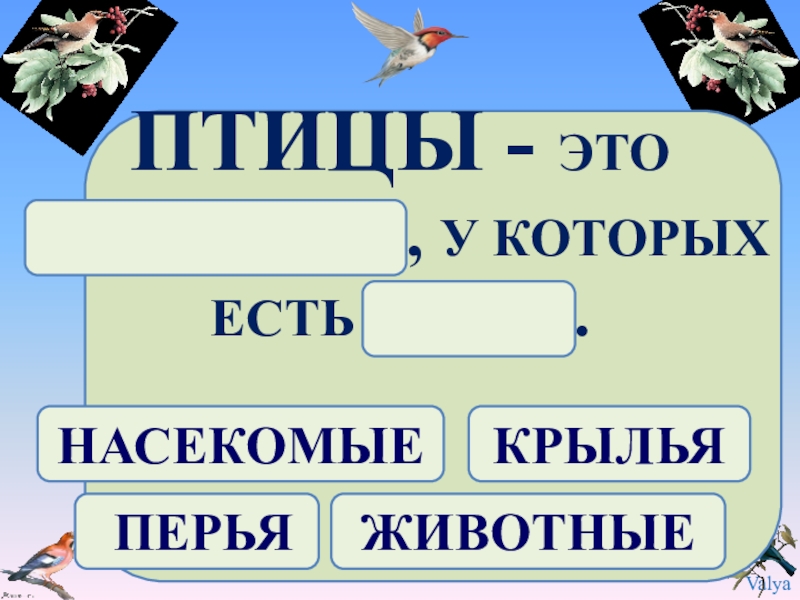 ПТИЦЫ - ЭТО ЖИВОТНЫЕ, У КОТОРЫХ  ЕСТЬ ПЕРЬЯ.КРЫЛЬЯ ПЕРЬЯНАСЕКОМЫЕЖИВОТНЫЕ