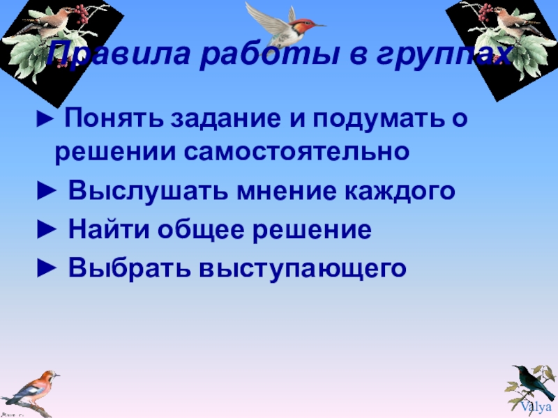 Правила работы в группах► Понять задание и подумать о решении самостоятельно► Выслушать мнение каждого► Найти общее решение►