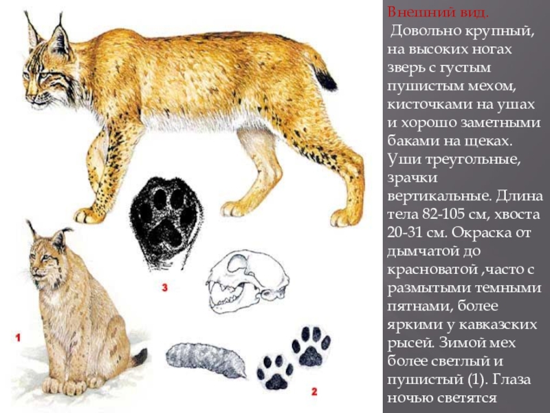 мехом, кисточками на ушах и хорошо заметными баками на щеках. Уши треугольные, зрачки вертикальные. Длина тела 82-105 см, хвоста 20-31 см. Окраска от дымчатой до красноватой ,часто с размытыми темными пятнами, более яркими у кавказских рысей. Зимой мех более светлый и пушистый (1). Глаза ночью светятся зеленым светом.