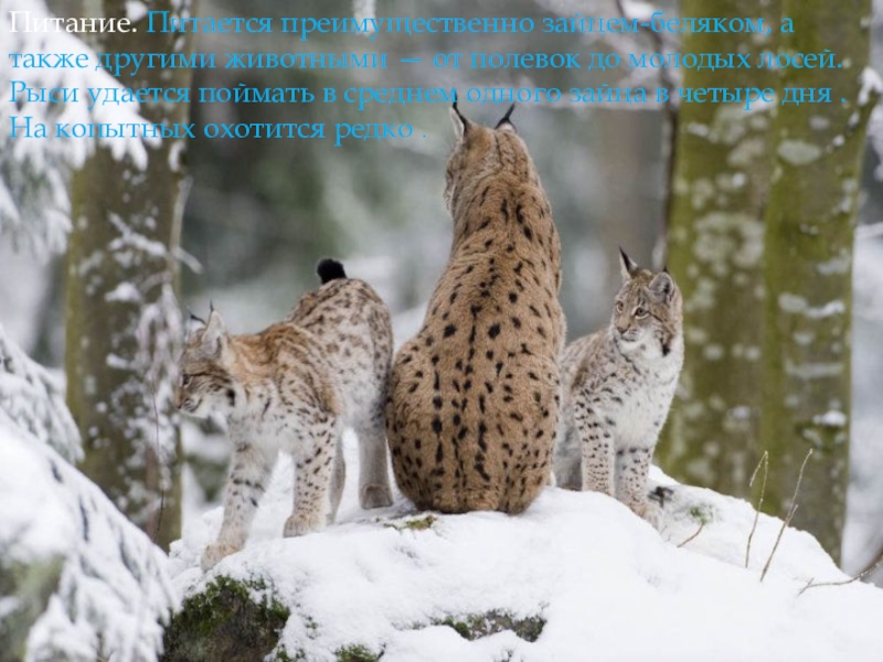 Питание. Питается преимущественно зайцем-беляком, а также другими животными — от полевок до молодых лосей. Рыси удается поймать