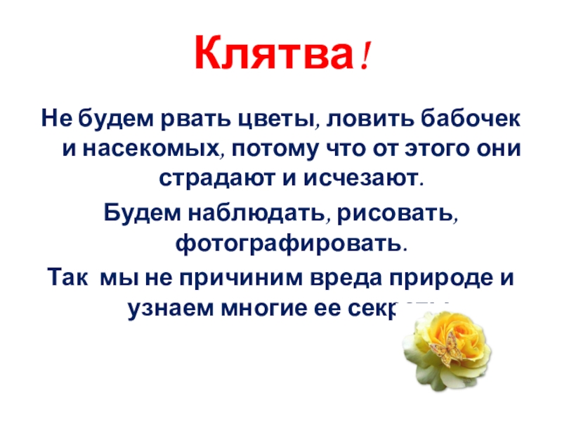 Клятва!Не будем рвать цветы, ловить бабочек и насекомых, потому что от этого они страдают и исчезают.Будем наблюдать,