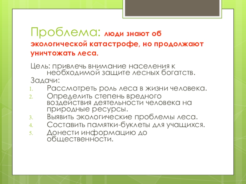 Проблема: люди знают об экологической катастрофе, но продолжают уничтожать леса.Цель: привлечь внимание населения к необходимой защите лесных богатств.Задачи:Рассмотреть роль леса в жизни человека.Определить степень вредного воздействия деятельности человека на природные ресурсы.Выявить экологические проблемы леса.Составить памятки-буклеты для