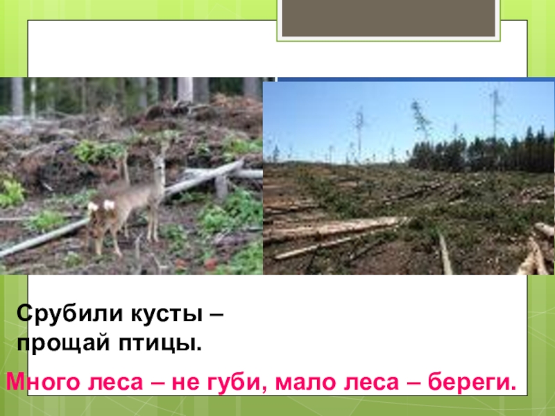 Вырубка лесаСрубили кусты – прощай птицы.Много леса – не губи, мало леса – береги.