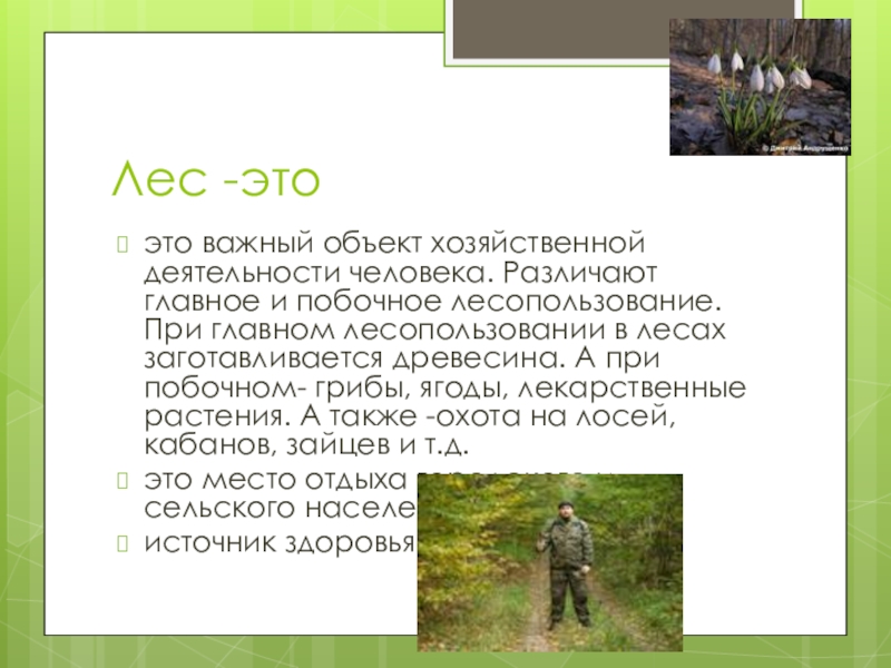Лес -этоэто важный объект хозяйственной деятельности человека. Различают главное и побочное лесопользование. При главном лесопользовании в лесах