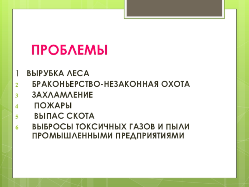 ПРОБЛЕМЫ1  ВЫРУБКА ЛЕСАБРАКОНЬЕРСТВО-НЕЗАКОННАЯ ОХОТАЗАХЛАМЛЕНИЕ ПОЖАРЫ ВЫПАС СКОТА ВЫБРОСЫ ТОКСИЧНЫХ ГАЗОВ И ПЫЛИ  ПРОМЫШЛЕННЫМИ ПРЕДПРИЯТИЯМИ