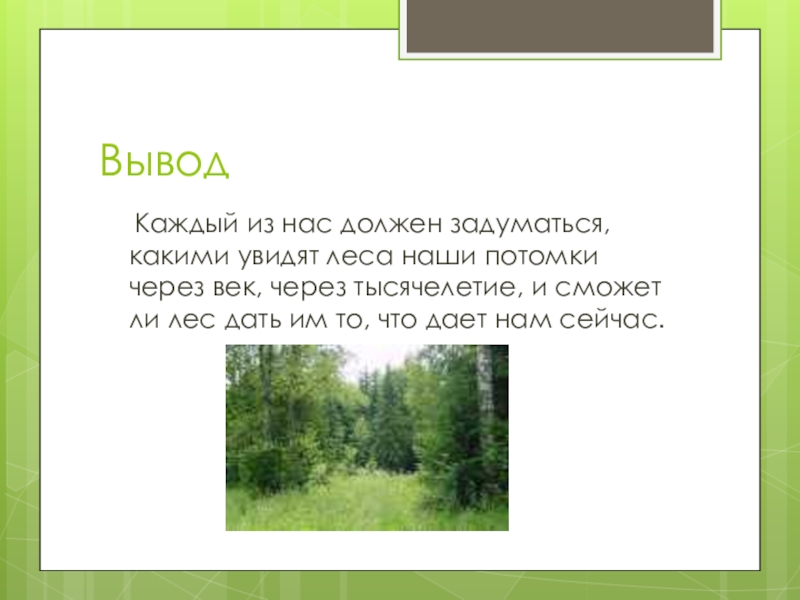 Вывод   Каждый из нас должен задуматься, какими увидят леса наши потомки через век, через тысячелетие,