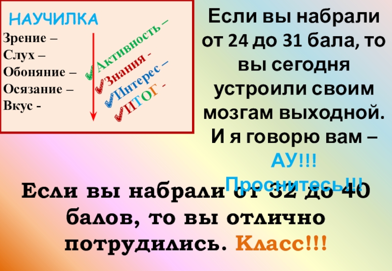 Если вы набрали от 24 до 31 бала, то вы сегодня устроили своим мозгам выходной. И я говорю вам – АУ!!! Проснитесь!!!