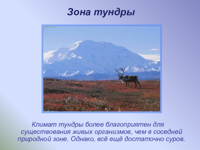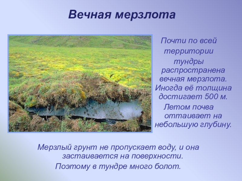 тундры распространена вечная мерзлота. Иногда её толщина достигает 500 м.